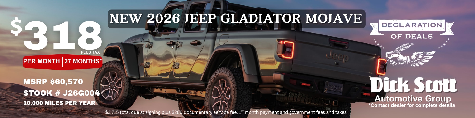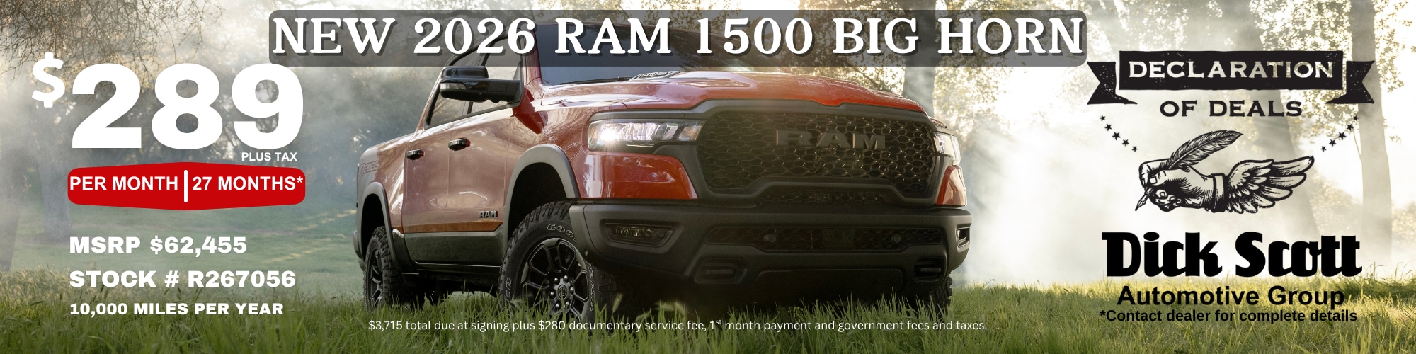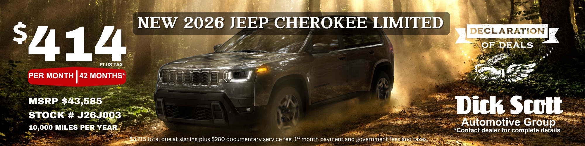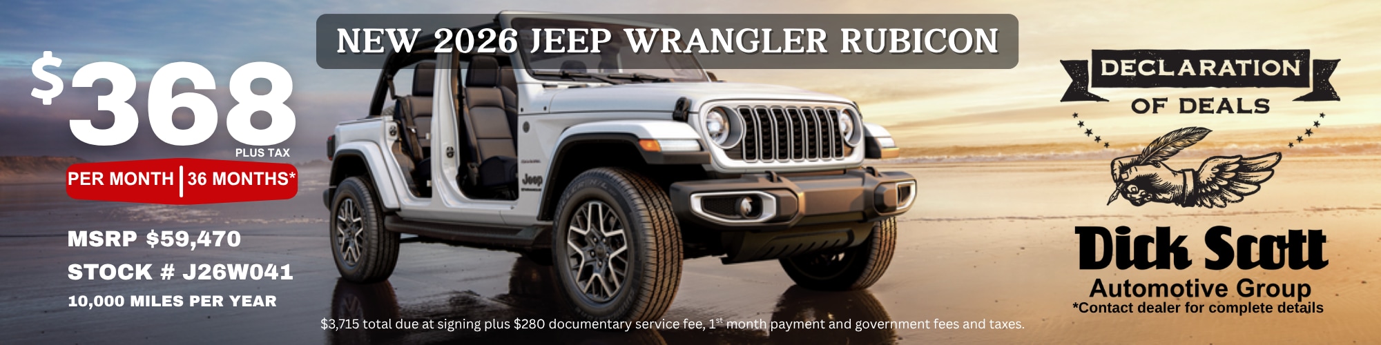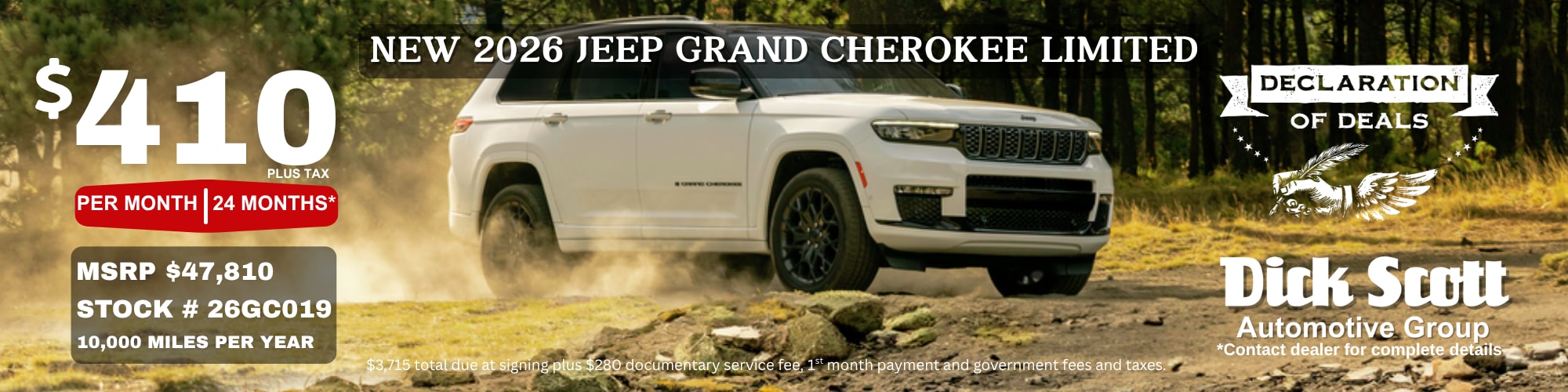 *Amount due at signing includes $3,995 cash or trade-in equity due from customer + $2,748 Employee Purchase Program + $750 Great Lakes BC Lease Bonus Cash + $500 Great Lakes BC Bonus Cash + $1,000 Nationa Stellantis Loyalty Bonus Cash + $2,000 National SFS Lease Loyalty Bonus Cash 39CT6. Plus government fees and taxes. Includes a $0 security deposit, $280 document fee. On approved credit, not all customers will qualify. Must qualify for tier 1 credit through preferred lending institutions. 10,000 miles per year, $0.25 per excess mile. MSRP: $47,810. Additional restrictions include: Closed-end lease based on term stated above. Must take delivery from dealer stock. Picture may not represent actual vehicle. Vehicle(s) eligible: 26GC019. Expires on April 30, 2026. Dick Scott Chrysler Dodge Jeep Ram and Dick Scott Motor Mall.
