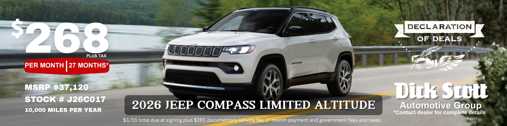 *Amount due at signing includes $3,995 cash or trade-in equity due from customer + $2,000 Employee Purchase Program + $750 Great Lakes BC Bonus Cash + $1,000 National Stellantis Loyalty Bonus Cash +$595 Select Inventory Bonus Cash 41CTS +$1,500 National SFS Lease Loyalty Bonus Cash 39CT6. Plus government fees and taxes. Includes a $0 security deposit, $280 document fee. On approved credit, not all customers will qualify. Must qualify for tier 1 credit through preferred lending institutions. 10,000 miles per year, $0.25 per excess mile. MSRP: $37,120. Additional restrictions include: Closed-end lease based on term stated above. Must take delivery from dealer stock. Picture may not represent actual vehicle. Vehicle(s) eligible: J26C017. Expires on April 30, 2026. Dick Scott Chrysler Dodge Jeep Ram and Dick Scott Motor Mall.