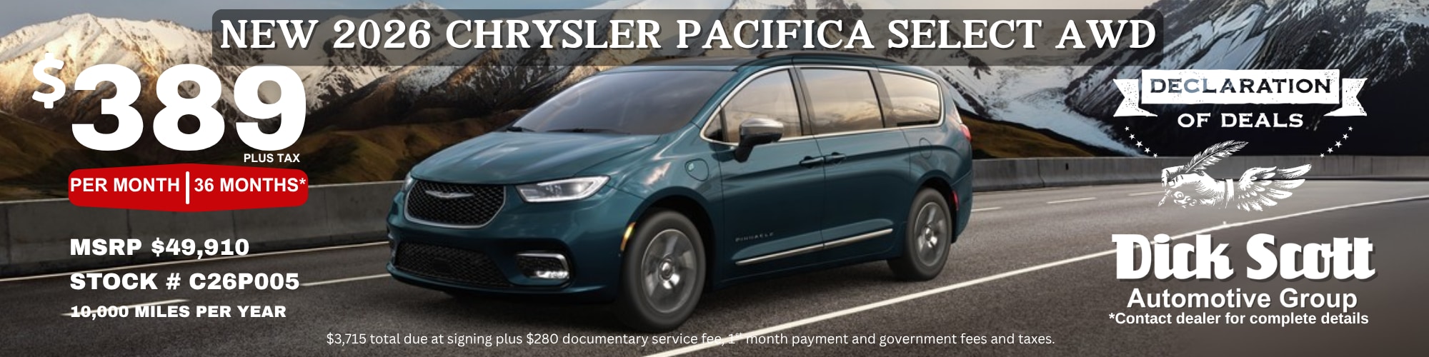 *Amount due at signing includes $3,995 cash or trade-in equity due from customer + $3,260 Employee Purchase Program +$2,500 National Lease Cash + $1,000 Great Lakes BC Select Inventory Bonus Cash Plus government fees and taxes. Includes a $0 security deposit, $280 document fee. On approved credit, not all customers will qualify. Must qualify for tier 1 credit through preferred lending institutions. 10,000 miles per year, $0.25 per excess mile. MSRP: $49,910. Additional restrictions include: Closed-end lease based on term stated above. Must take delivery from dealer stock. Picture may not represent actual vehicle. Vehicle(s) eligible: C26P005. Expires on April 30, 2026. Dick Scott Chrysler Dodge Jeep Ram and Dick Scott Motor Mall.
