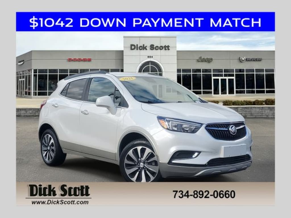 Dick Scott CDJR is proud to offer this attractive 2021 Buick Encore in White Frost Tricoat This vehicle comes with the following Buick Interior Protection Package (LPO) (All-Weather Floor Mats and Color-Keyed Carpeted Cargo Mat (LPO)), Preferred Equipment Group 1SB, 18" Aluminum Wheels, 2-Way Manual Front Passenger Seat Adjuster, 3.53 Final Drive Axle Ratio, 4-Wheel Disc Brakes, 6 Speakers, 6-Speaker Audio System, 6-Way Power Driver Seat Adjuster, ABS brakes, Air Conditioning, Alloy wheels, AM/FM radio: SiriusXM, Apple CarPlay/Android Auto, Brake assist, Bumpers: body-color, Cloth w/Leatherette Seat Trim, Compass, Delay-off headlights, Driver door bin, Driver vanity mirror, Driver's Seat Mounted Armrest, Dual front impact airbags, Dual front side impact airbags, Electronic Stability Control, Emergency communication system: OnStar and Buick connected services capable, Exterior Parking Camera Rear, Front anti-roll bar, Front Bucket Seats, Front reading lights, Front wheel independent suspension, Fully automatic headlights, Heated door mirrors, Illuminated entry, Knee airbag, Leather steering wheel, Low tire pressure warning, Occupant sensing airbag, Outside temperature display, Overhead airbag, Panic alarm, Passenger door bin, Passenger vanity mirror, Power door mirrors, Power driver seat, Power steering, Power windows, Radio data system, Radio: 7" Diagonal Buick Infotainment System, Radio: Buick Infotainment System AM/FM Stereo (DISC), Rear seat center armrest, Rear side impact airbag, Rear window defroster, Rear window wiper, Remote keyless entry, Remote Vehicle Starter System, Ride & Handling Suspension, Roof rack: rails only, Security system, SiriusXM Radio, Speed control, Speed-sensing steering, Split folding rear seat, Spoiler, Steering wheel mounted audio controls, Tachometer, Telescoping steering wheel, Tilt steering wheel, Traction control, Trip computer, Variably intermittent wipers, and Wheel Lock Kit (LPO); AWD, All-Weather Floor Mats, Buick Interior Protection Package (LPO), Color-Keyed Carpeted Cargo Mat (LPO), Preferred Equipment Group 1SB.