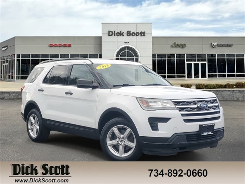 Dick Scott CDJR is pumped up to offer this good-looking 2018 Ford Explorer in Oxford White This vehicle comes with the following Equipment Group 100A, 4WD, Air Conditioning, Power driver seat, Remote keyless entry, 18" Painted Aluminum Wheels, 3.65 Axle Ratio, 3rd row seats: split-bench, 4-Wheel Disc Brakes, 6 Speakers, ABS brakes, Alloy wheels, AM/FM radio, AM/FM Stereo, Brake assist, Bumpers: body-color, Cloth Bucket Seats, Compass, Delay-off headlights, Driver door bin, Driver vanity mirror, Dual front impact airbags, Dual front side impact airbags, Electronic Stability Control, Emergency communication system: 911 Assist, Exterior Parking Camera Rear, Four wheel independent suspension, Front anti-roll bar, Front Bucket Seats, Front Center Armrest, Front License Plate Bracket, Front reading lights, Fully automatic headlights, Heated door mirrors, Illuminated entry, Knee airbag, Low tire pressure warning, Occupant sensing airbag, Outside temperature display, Overhead airbag, Overhead console, Panic alarm, Passenger door bin, Passenger vanity mirror, Power door mirrors, Power steering, Power windows, Rear air conditioning, Rear anti-roll bar, Rear reading lights, Rear seat center armrest, Rear window defroster, Rear window wiper, Roof rack: rails only, SiriusXM Satellite Radio, Speed control, Speed-sensing steering, Speed-Sensitive Wipers, Split folding rear seat, Spoiler, Steering wheel mounted audio controls, SYNC Communication & Entertainment System, Tachometer, Telescoping steering wheel, Tilt steering wheel, Traction control, Trip computer, and Variably intermittent wipers; **4X4**, 4WD, Air Conditioning, Equipment Group 100A, Power driver seat, Remote keyless entry.