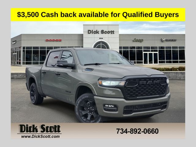 This 1500 Big Horn/Lone Star is nicely equipped with Big Horn Level 1 Equipment Group (115V Auxiliary Power Outlet, 2nd Row in Floor Storage Bins, 3 Rear Seat Head Restraints, 4 Way Front Headrests, 400W Inverter, Auto Power-Folding Mirrors, Auto-Dimming Exterior Driver Mirror, Auto-Dimming Rear-View Mirror, Black Exterior Mirrors, Black Premium Power Mirrors, Body Color Fender Flares, Bucket Seats, Center Console Parts Module, Convex Wide-Angle Exterior Mirror Insert, Deluxe Cloth Bucket Seats, Exterior Mirrors Courtesy Lamps, Exterior Mirrors with Heating Element, Exterior Mirrors with Supplemental Signals, Front Seat Back Map Pockets, Full Length Floor Console, Glove Box Lamp, Heated Front Seats, Heated Steering Wheel, Leather Wrapped Steering Wheel, Manual Adjust 4-Way Front Passenger Seat, Power 2-Way Driver Lumbar Adjust, Power Adjust 8-Way Driver Seat, Power Adjustable Pedals, Rear 60/40 Folding Seat, Rear Center Armrest, Rear Dome with on/Off Switch Lamp, Rear Power Sliding Window, Rear Window Defroster, SiriusXM Radio Service, SiriusXM Satellite Radio, Steering Wheel Mounted Audio Controls, Sun Visors with Illuminated Vanity Mirrors, and Universal Garage Door Opener), Night Edition (Accent Color Door Handles, Accent Color Premium Power Mirrors, Accent Color Tailgate Handle, Anti-Spin Differential Rear Axle, Black Exterior Truck Badging, Black Headlamp Bezels, Black Interior Accents, Black Painted Exterior Mirrors Caps, Black Tail Lamp Bezels, Body Color Front Bumper, Body Color Rear Bumper with Step Pads, Dual Exhaust with Black Tips, Grille Black Surround Black Mesh, RAM Grille Badge - Black, and Wheels: 20" x 9.0" Aluminum Painted Clad), Quick Order Package 23Z Big Horn, 4-Wheel Disc Brakes, 48V Belt Starter Generator, 4G LTE Wi-Fi Hot Spot, 6 Speakers, ABS brakes, Air Conditioning, Alloy wheels, AM/FM radio, Apple CarPlay, Apple CarPlay/Android Auto, Auto High-beam Headlights, Brake assist, Bumpers: chrome, Cloth Bucket Seats, Compass, Connectivity - US/Canada, Delay-off headlights, Driver door bin, Dual front impact airbags, Dual front side impact airbags, Electronic Stability Control, Front anti-roll bar, Front Bucket Seats, Front Center Armrest w/Storage, Front fog lights, Front reading lights, Front wheel independent suspension, Fully automatic headlights, Global Telematics Box Module, Google Android Auto, GPS Antenna Input, Heated door mirrors, Illuminated entry, Integrated Center Stack Radio, Integrated Voice Command with Bluetooth, Low tire pressure warning, Manual Adjust 4-Way Driver Seat, Manual Folding Exterior Mirrors, Manufacturer's Statement of Origin, MOPAR Front and Rear Rubber Floor Mats, MyFlexCare Service Plan, Occupant sensing airbag, Outside temperature display, Overhead airbag, Overhead console, Panic alarm, ParkView Rear Back-Up Camera, Passenger door bin, Passenger vanity mirror, Power door mirrors, Power steering, Power windows, Radio data system, Radio: Uconnect 5 W with 8.4" Display, RAM Grille Badge - Chrome, Rear anti-roll bar, Rear step bumper, Rear Wheelhouse Liners, Remote keyless entry, Speed control, Supplier Part Tracking (J-1), Tachometer, Telescoping steering wheel, Tilt steering wheel, Traction control, Trip computer, USB Host Flip, Variably intermittent wipers, and Voltmeter... Customers must qualify for FCA employee pricing and qualify for the following rebates, Price includes: $3500 - 2026 National Retail Bonus Cash . Exp. 03/31/2026